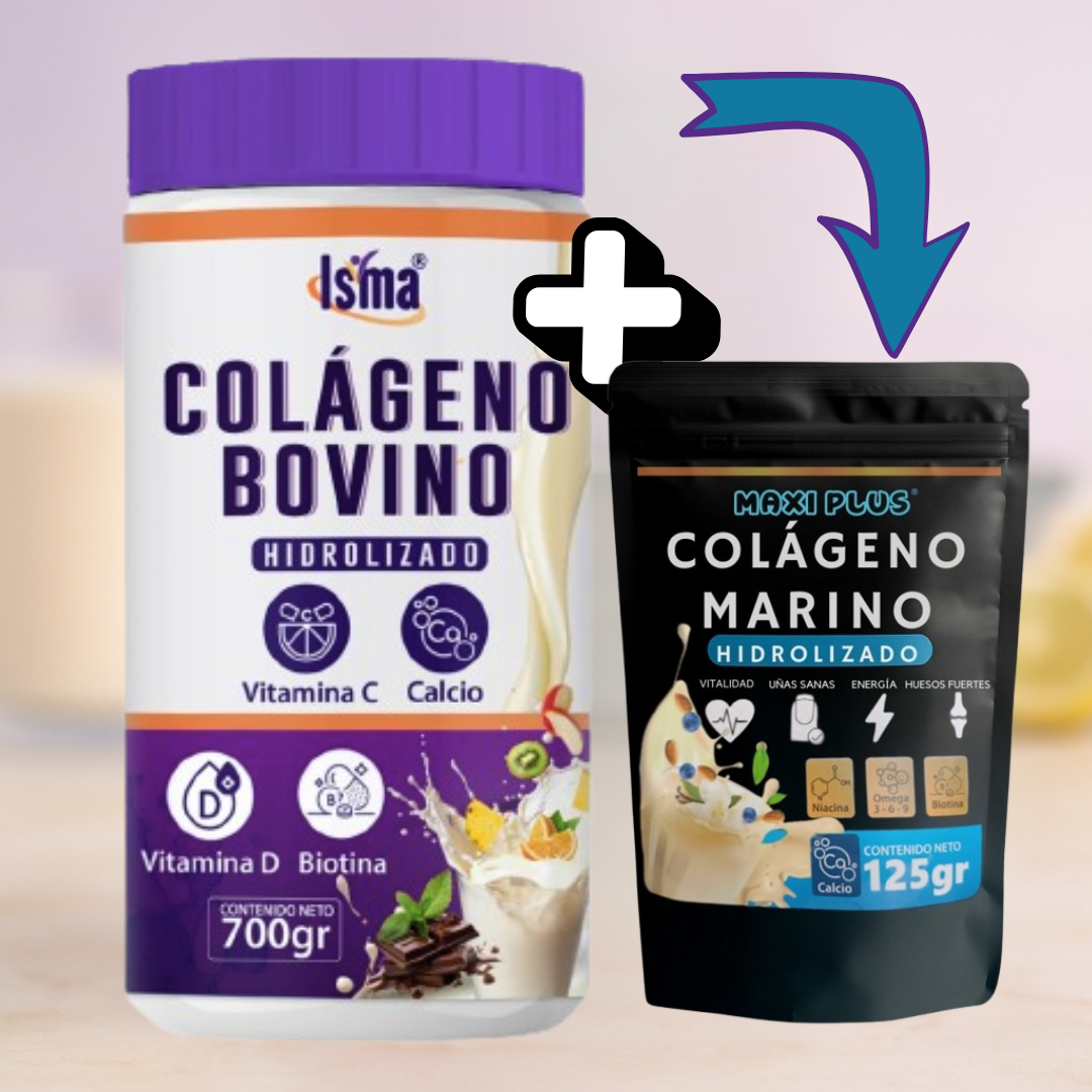 Este combo combina colágeno bovino y marino, dos fuentes reconocidas por su aporte de aminoácidos esenciales para el cuidado de la piel, las articulaciones y los huesos.